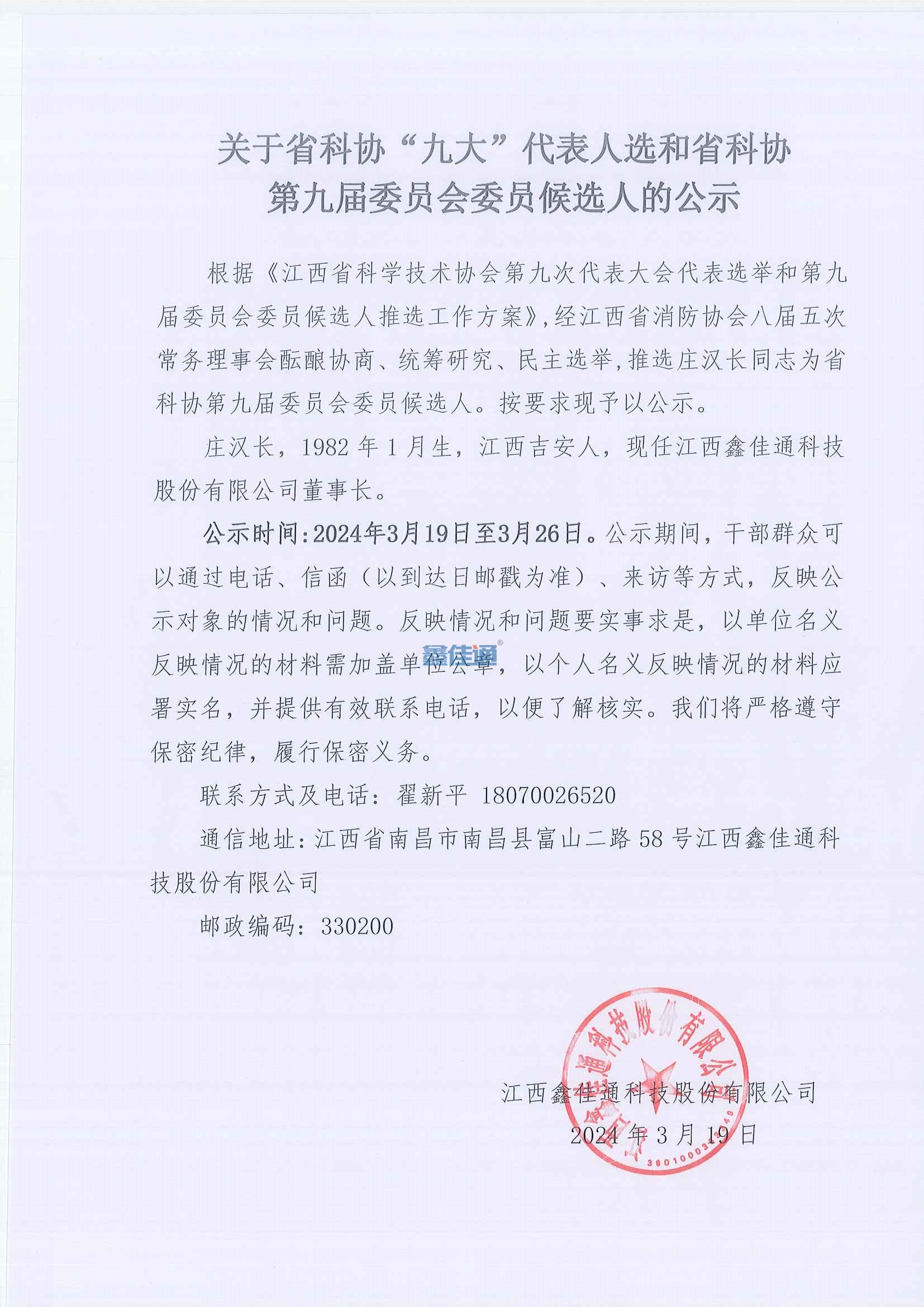 根据《江西省科学技术协会第九次代表大会代表选举和第九届委员会委员候选人推选工作方案》,经江西省消防协会八届五次常务理事会酝酿协商、统筹研究、民主选举,推选庄汉长同志为省科协第九届委员会委员候选人。按要求现予以公示。庄汉长,1982年1月生,江西吉安人,现任江西鑫佳通科技股份有限公司董事长。