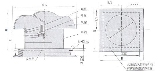b、离心式屋顶风机:代号为DWT-II,型、DWT-III型二种型式,适用于风量较小而压力要求较高的场合。